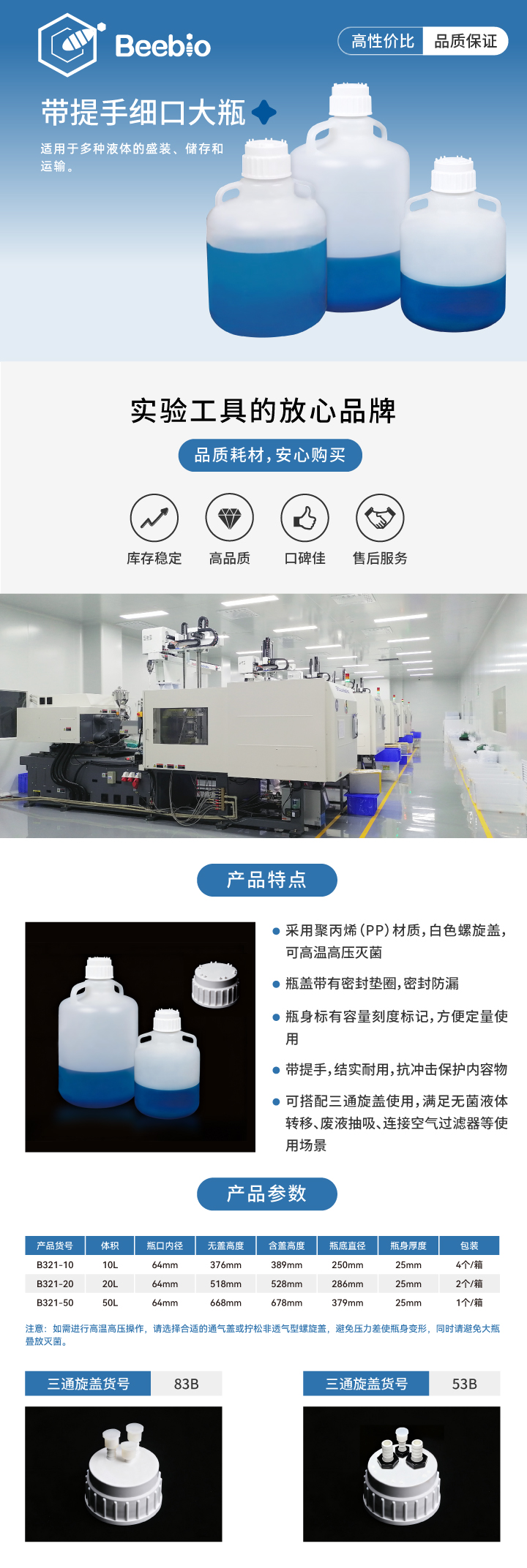 Beebio 细口大瓶(带手提)适用于大体积溶液的盛装、储存以及运输,可搭配三通旋盖实现液体的无菌转移,结实耐用,可高温高压灭菌。